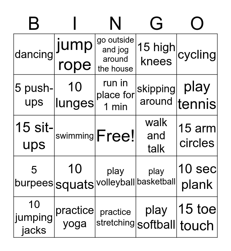 This bingo card has a free space and 24 words: 10 squats, practice yoga, run in place for 1 min, 10 jumping jacks, cycling, dancing, 5 push-ups, jump rope, walk and talk, play volleyball, skipping around, 15 sit-ups, play basketball, 10 sec plank, 10 lunges, play softball, 15 arm circles, go outside and jog around the house, play tennis, swimming, 15 toe touch, 5 burpees, 15 high knees and practice stretching.
