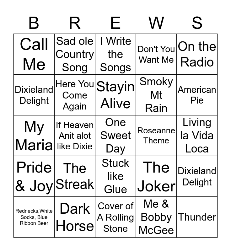 This bingo card has a free space and 24 words: The Streak, Dark Horse, Stayin Alive, Rednecks,White Socks, Blue Ribbon Beer, On the Radio, Call Me, Dixieland Delight, Sad ole Country Song, Roseanne Theme, Stuck like Glue, Smoky Mt Rain, My Maria, The Joker, Dixieland Delight, Here You Come Again, Me & Bobby McGee, Living la Vida Loca, I Write the Songs, American Pie, If Heaven Anit alot like Dixie, Thunder, Pride & Joy, Don't You Want Me and Cover of A Rolling Stone.