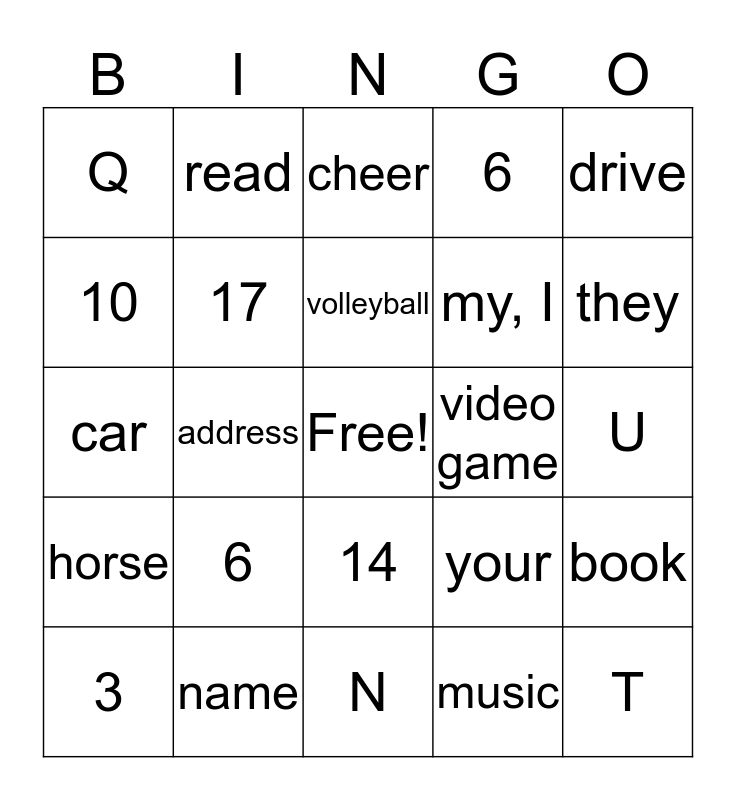 This bingo card has a free space and 24 words: 6, name, volleyball, 3, drive, Q, 10, read, video game, 14, my, I, car, your, book, 17, music, U, cheer, they, address, T, horse, 6 and N.