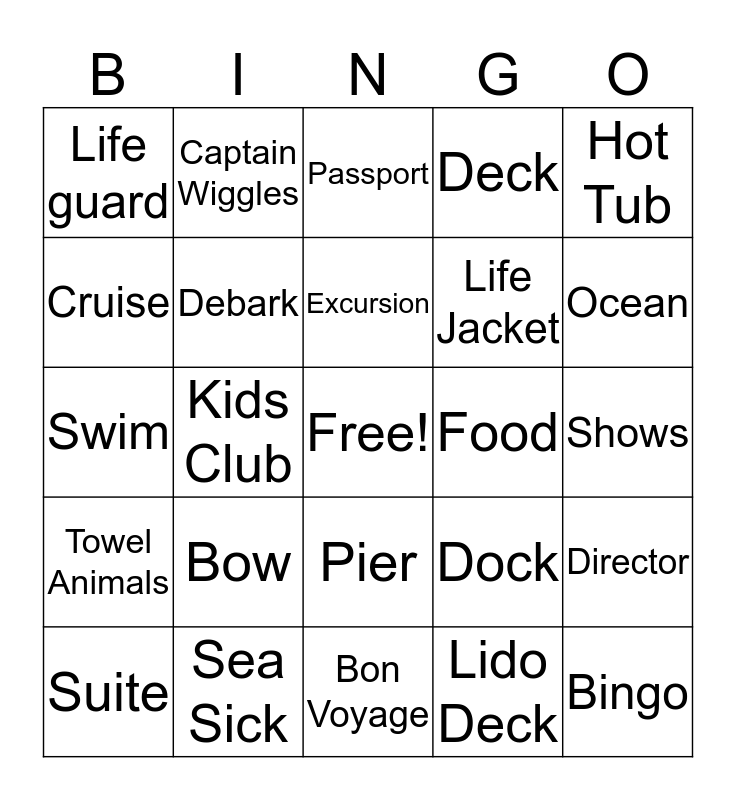 This bingo card has a free space and 50 words: Anchor, Bingo, Boarding Pass, Bon Voyage, Bow, Buffet, Captain Wiggles, Course, Cruise, Dancers, Debark, Deck, Director, Dock, Drinks, Embark, Excursion, Food, Gate way, Hot Tub, Kids Club, Lido Deck, Life guard, Life Jacket, Lifeboat, Muster Drill, Ocean, Overboard, Passport, Pier, Port of call, Porthole, Promenade, Purser, Sea Sick, Set sail, Ship, Shopping, Shore, Shows, Snorkeling, Star Board, Stern, Steward, Suite, Swim, Tender, Mardi Gras, Towel Animals and Waves.