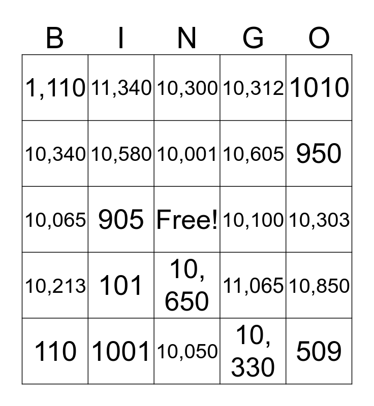 This bingo card has a free space and 24 words: 101, 1001, 10,001, 110, 1010, 1,110, 10,340, 11,340, 10,100, 10, 650, 10,605, 10,065, 11,065, 10,850, 10,580, 10, 330, 10,303, 10,300, 950, 905, 509, 10,213, 10,312 and 10,050.