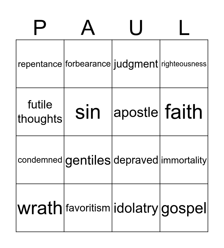 This bingo card has 16 words: favoritism, immortality, judgment, repentance, condemned, forbearance, depraved, idolatry, futile thoughts, sin, wrath, righteousness, gentiles, faith, apostle and gospel.