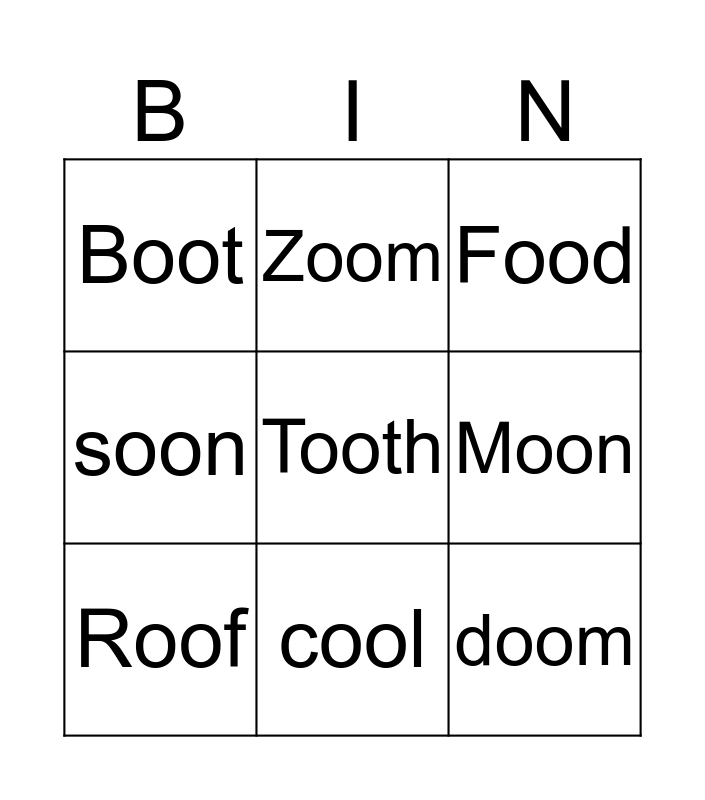 This bingo card has a free space and 8 words: Moon, Food, Zoom, Roof, Boot, doom, soon and cool.