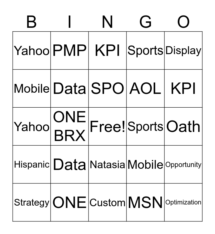 This bingo card has a free space and 65 words: Deal ID, PMP, Ads.txt, Opportunity, Performanc, Deal ID, PMP, Ads.txt, SPO, Optimization, Natasia, Strategy, Oath, Display, Video, Mobile, ONE BRX, Yahoo, MSN, AOL, Data, Hispanic, Sports, O&O, Deal ID, PMP, Ads.txt, SPO, Optimization, Natasia, Strategy, Oath, Display, Video, Mobile, ONE, Brightroll, Yahoo, MSN, AOL, Data, Spanish, Sports, O&O, Opportunity, Performance, KPI, Amnet, DSP, Bidder, Brand, Love, Targeting, Custom, Exchange, Opportunity, Performance, KPI, Amnet, DSP, Bidder, Brand, Love, Targeting and Custom.