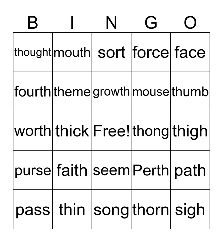 This bingo card has a free space and 30 words: thin, sin, thick, sick, thought, sort, theme, seem, thong, song, thigh, sigh, thorn, sawn, thumb, some, Perth, purse, faith, face, worth, worse, mouth, mouse, fourth, force, path, pass, growth and gross.
