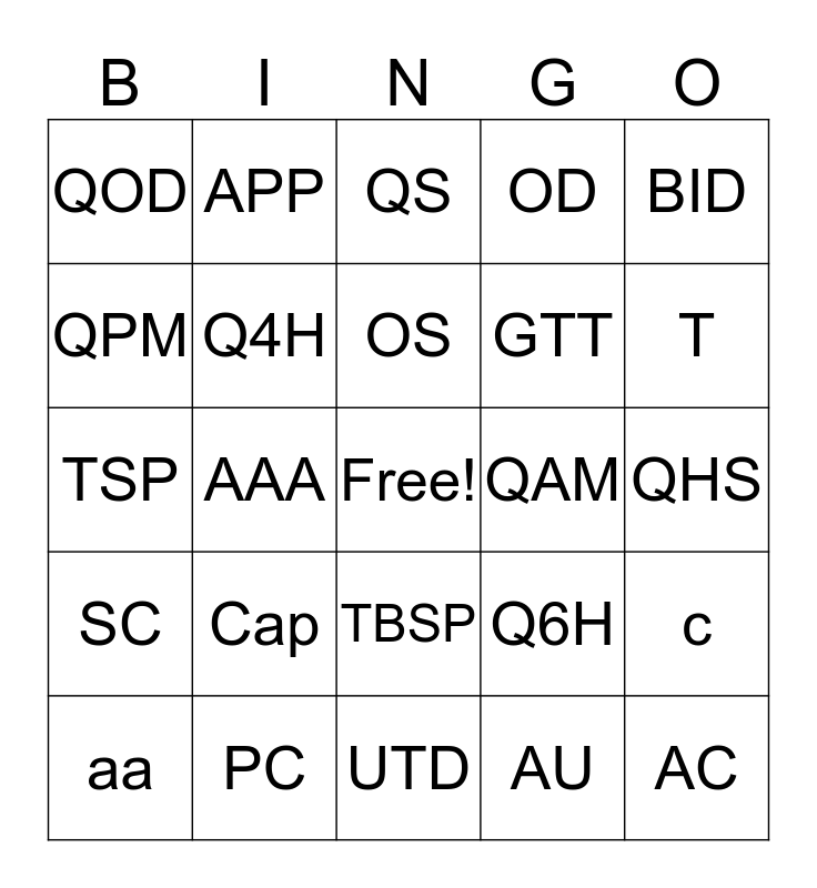 This bingo card has a free space and 44 words: PRN, AC, p, aa, H, AU, QS, SL, BID, PC, OD, QAM, TBSP, Cap, Sub-q, UTD, Q, TSP, SL, T, APP, PR, PO, QOD, Q8H, QHS, ss, TID, Q6H, SC, QD, c, N/V, STAT, AAA, Tab, AS, OU, OS, QPM, GTT, QID, Q4H and PRNP.