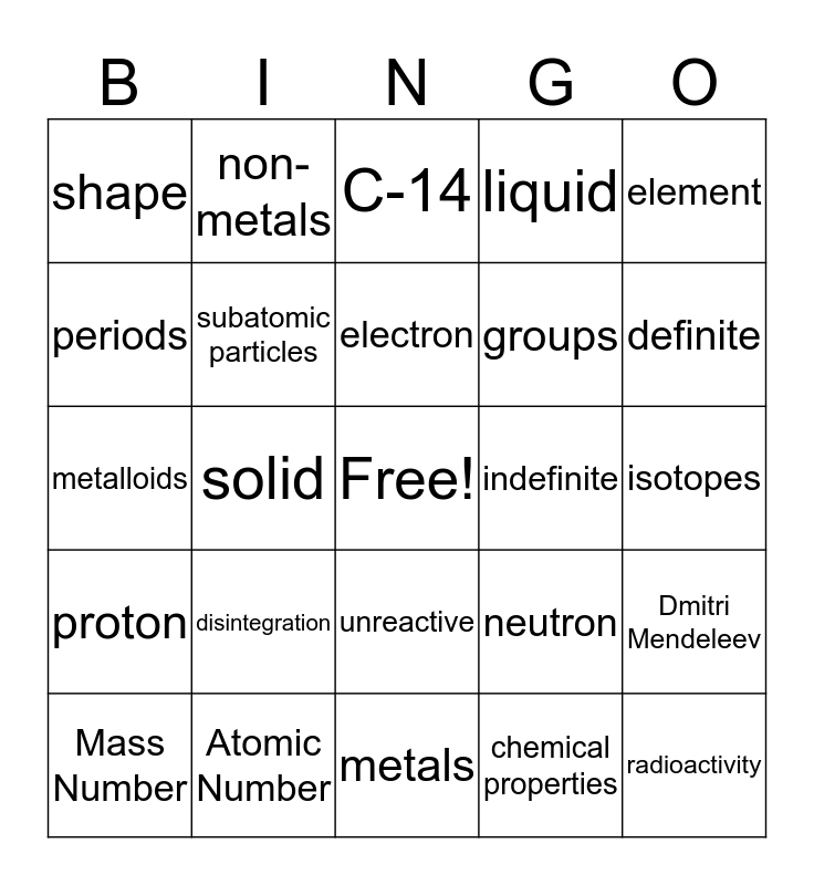 This bingo card has a free space and 36 words: matter, atoms, nucleus, subatomic particles, neutron, proton, electron, neutral, element, compound, solid, liquid, gas, indefinite, definite, shape, volume, disintegration, radioactivity, C-14, isotopes, Dmitri Mendeleev, Atomic Number, Mass Number, metals, non-metals, metalloids, Noble gases, groups, periods, positive, negative, chemical properties, unreactive, phases and shells.