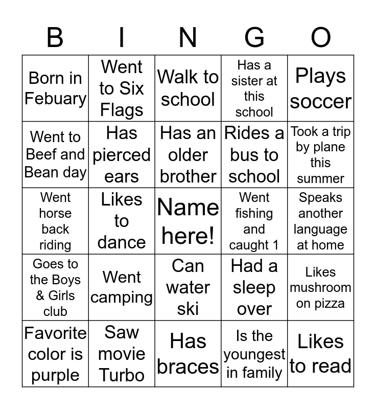 This bingo card has a free space and 24 words: Went camping, Saw movie Turbo, Has an older brother, Favorite color is purple, Plays soccer, Born in Febuary, Went to Beef and Bean day, Went to Six Flags, Went fishing and caught 1, Can water ski, Rides a bus to school, Went horse back riding, Had a sleep over, Likes mushroom on pizza, Has pierced ears, Is the youngest in family, Speaks another language at home, Walk to school, Took a trip by plane this summer, Likes to dance, Likes to read, Goes to the Boys & Girls club, Has a sister at this school and Has braces.