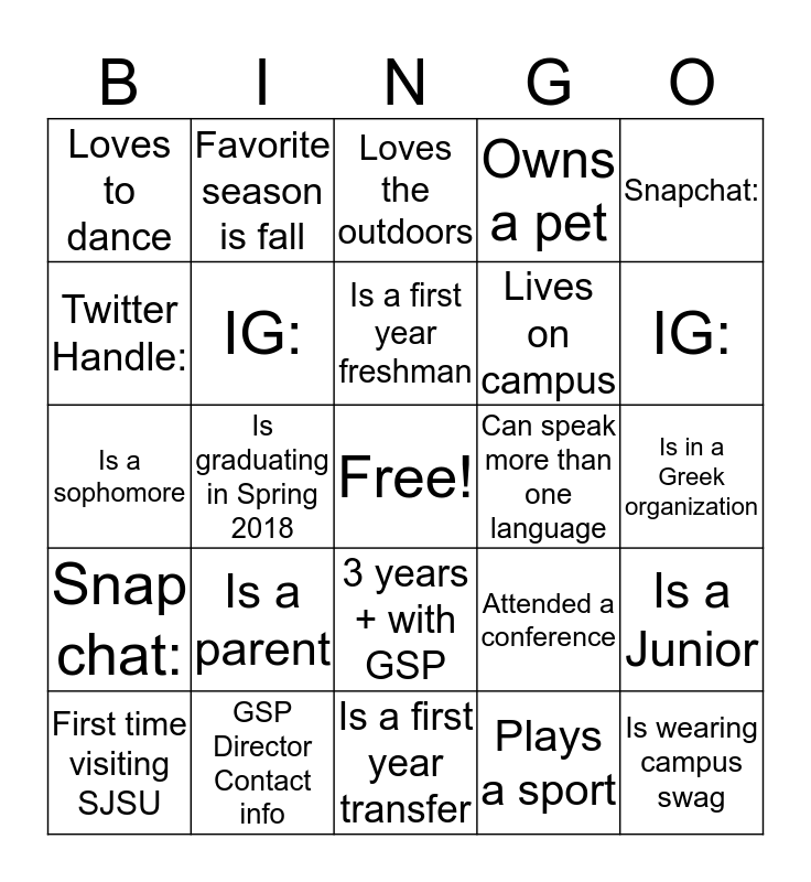 This bingo card has a free space and 24 words: Is a parent, GSP Director Contact info, Is a first year freshman, First time visiting SJSU, Snapchat:, Loves to dance, Twitter Handle:, Favorite season is fall, Can speak more than one language, 3 years + with GSP, Lives on campus, Is a sophomore, Attended a conference, Is a Junior, IG:, Plays a sport, Is in a Greek organization, Loves the outdoors, IG:, Is graduating in Spring 2018, Is wearing campus swag, Snap chat:, Owns a pet and Is a first year transfer.