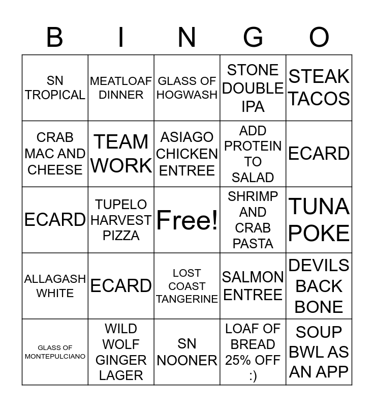 This bingo card has a free space and 24 words: ECARD, WILD WOLF GINGER LAGER, ASIAGO CHICKEN ENTREE, GLASS OF MONTEPULCIANO, STEAK TACOS, SN TROPICAL, CRAB MAC AND CHEESE, MEATLOAF DINNER, SHRIMP AND CRAB PASTA, LOST COAST TANGERINE, ADD PROTEIN TO SALAD, ECARD, SALMON ENTREE, DEVILS BACK BONE, TEAM WORK, LOAF OF BREAD 25% OFF :), TUNA POKE, GLASS OF HOGWASH, ECARD, TUPELO HARVEST PIZZA, SOUP BWL AS AN APP, ALLAGASH WHITE, STONE DOUBLE IPA and SN NOONER.