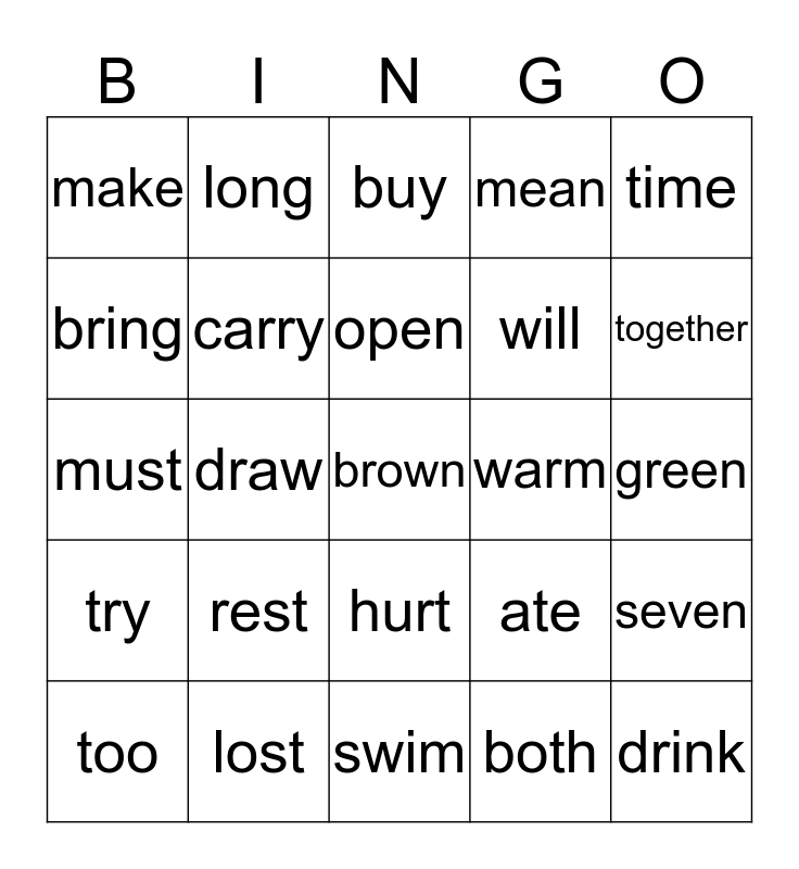 This bingo card has 25 words: rest, swim, open, too, time, make, bring, long, warm, hurt, will, must, ate, seven, carry, drink, green, buy, together, draw, brown, lost, try, mean and both.