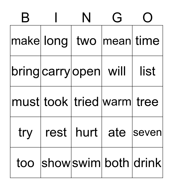 This bingo card has 25 words: rest, swim, open, too, time, make, bring, long, warm, hurt, will, must, ate, seven, carry, drink, tree, two, list, took, tried, show, try, mean and both.