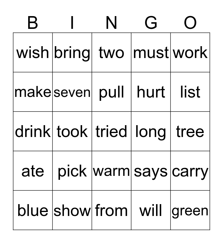 This bingo card has 25 words: pick, from, pull, blue, work, wish, make, bring, long, warm, hurt, drink, says, carry, seven, green, tree, two, list, took, tried, show, ate, must and will.