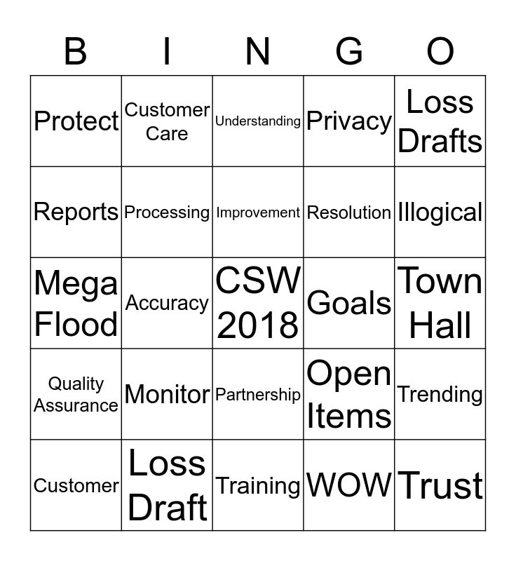 This bingo card has a free space and 33 words: Cares, Build, Accuracy, Client Services, Quality Assurance, Processing, Loss Drafts, Customer, Customer Care, Human Resources, Improvement, Understanding, Confidence, Grow, Goals, Illogical, Loss Draft, Mega Flood, Monitor, Open Items, Partnership, Patience, Protect, Town Hall, Training, Trust, Privacy, Resolution, Reports, Trending, Insurance, WOW and Client.