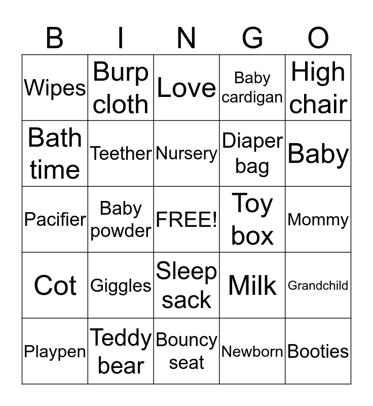 This bingo card has a free space and 76 words: Sippy cup, Baby walker, Love, Diapers, Baby shampoo, Wash cloth, Ultrasound, Baby carrier, Mittens, Nursery rhyme, Cravings, Grandson, Nursery, Bath time, Toddler, Baby powder, Blue, Booties, Hooded towel, High chair, Baby socks, Pacifier, Teether, Burp cloth, Baby cardigan, Onesie, LullabyCrying, Colic, Mobiles, Stork, Security blanket, Cradle, Gifts, Milk, Baby, Diaper bag, Formula, Towel, Mommy, Newborn, Baby book, Play gym, Bottle, Baby shirt, Rattle, Diaper pins, Playpen, Wipes, Bib, Gerber, Blankie, Sleep sack, Nap time, Teething ring, Boy, Playsuit, Rubber duck, Baby sling, Clothes, Baby food, Giggles, Family, Baby monitor, Baby lotion, Blanket sleeper, Baby swing, Toy box, Bassinet, Baby bathtub, Stroller, Grandchild, Cot, Teddy bear, Bonnet, Bouncy seat and Baby hat.