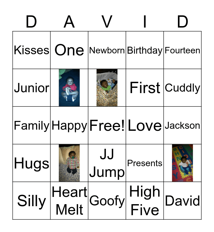This bingo card has 7 images, a free space and 31 words: October, Fourteen, First, Happy, Birthday, David, Jackson, Junior, Hugs, Libra, Newborn, Boy, Love, Kisses, Heart Melt, Cuddly, Silly, Funny, Goofy, Carseat, Sippy Cup, Enfamil, Crib, Diapers, JJ Jump, High Five, One, Special, Presents, Family and Friends.