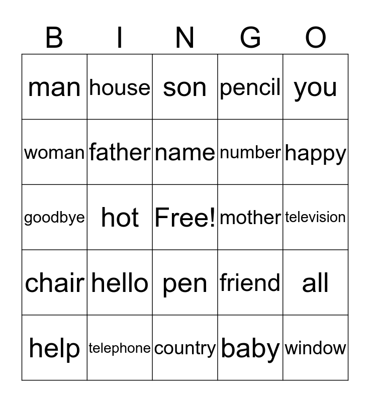 This bingo card has a free space and 24 words: hello, telephone, name, help, you, man, woman, house, mother, pen, number, goodbye, friend, all, father, baby, television, son, happy, hot, window, chair, pencil and country.