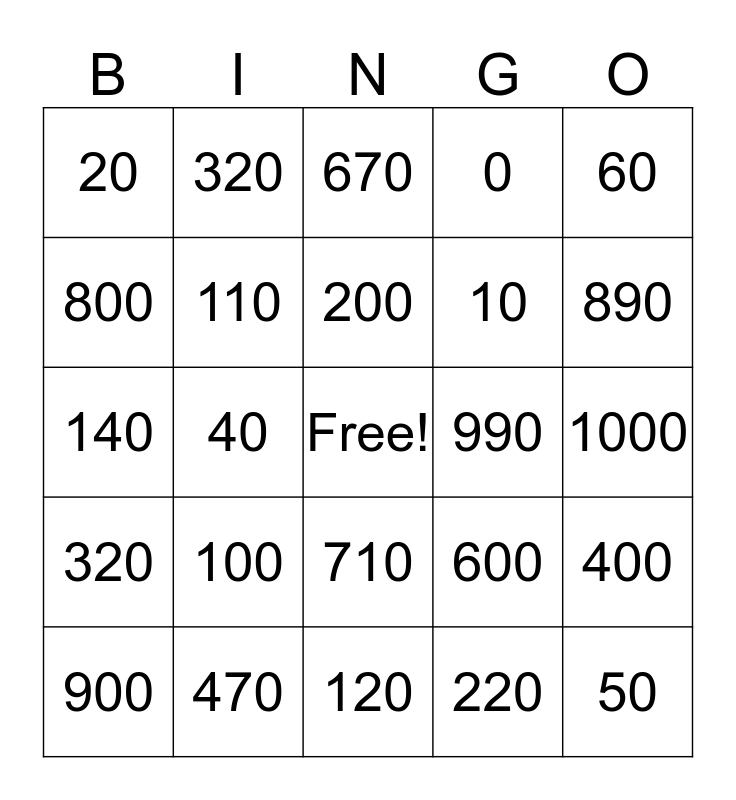 This bingo card has a free space and 24 words: 900, 100, 200, 220, 60, 20, 320, 670, 990, 1000, 140, 110, 600, 400, 800, 470, 120, 0, 890, 320, 40, 710, 10 and 50.