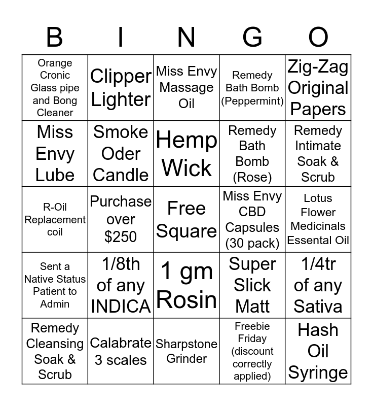 This bingo card has a free space and 24 words: 1/8th of any INDICA, Calabrate 3 scales, Hemp Wick, Remedy Cleansing Soak & Scrub, Zig-Zag Original Papers, Orange Cronic Glass pipe and Bong Cleaner, Miss Envy Lube, Clipper Lighter, Miss Envy CBD Capsules (30 pack), 1 gm Rosin, Remedy Bath Bomb (Rose), R-Oil Replacement coil, Super Slick Matt, 1/4tr of any Sativa, Smoke Oder Candle, Freebie Friday (discount correctly applied), Lotus Flower Medicinals Essental Oil, Miss Envy Massage Oil, Remedy Intimate Soak & Scrub, Purchase over $250, Hash Oil Syringe, Sent a Native Status Patient to Admin, Remedy Bath Bomb (Peppermint) and Sharpstone Grinder.