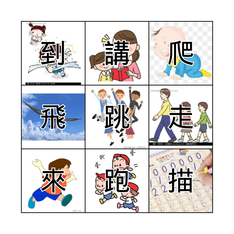 This bingo card has 12 images and 12 words: 回家, 描, 跳, 走, 講, 爬, 跑, 用, 到, 飛, 來 and 爬樹.
