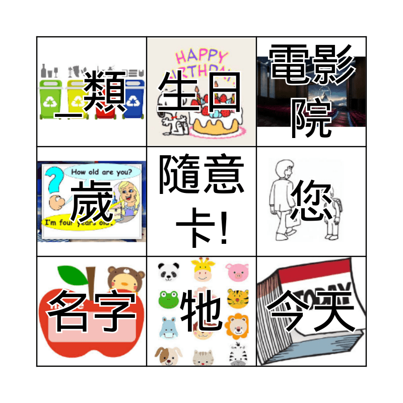 This bingo card has 8 images, a free space and 8 words: 您, 電影院, 生日, 名字, _類, 今天, 歲 and 牠.