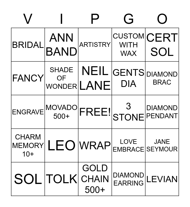 This bingo card has a free space and 24 words: LEO, TOLK, NEIL LANE, SOL, CERT SOL, BRIDAL, FANCY, ANN BAND, 3 STONE, WRAP, GENTS DIA, ENGRAVE, LOVE EMBRACE, JANE SEYMOUR, SHADE OF WONDER, DIAMOND EARRING, DIAMOND PENDANT, ARTISTRY, DIAMOND BRAC, MOVADO 500+, LEVIAN, CHARM MEMORY 10+, CUSTOM WITH WAX and GOLD CHAIN 500+.