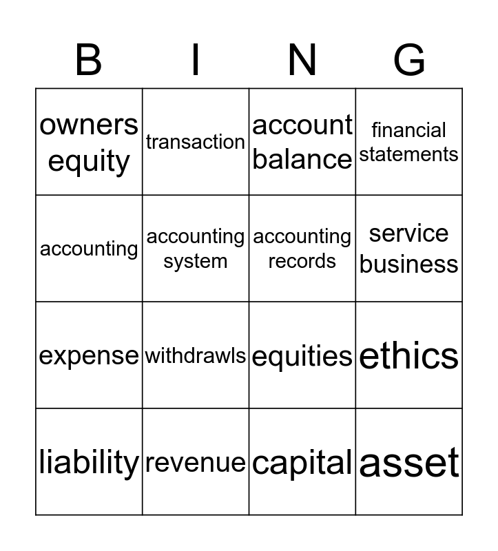 This bingo card has 16 words: revenue, ethics, account balance, owners equity, expense, transaction, equities, capital, accounting, accounting system, liability, financial statements, withdrawls, service business, accounting records and asset.