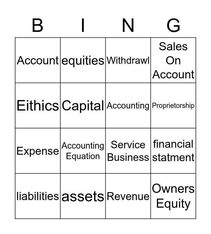 This bingo card has 16 words: assets, financial statment, Withdrawl, Account, Expense, equities, Service Business, Revenue, Eithics, Capital, liabilities, Sales On Account, Accounting Equation, Proprietorship, Accounting and Owners Equity.