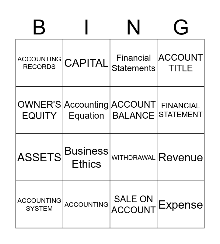 This bingo card has 16 words: ACCOUNTING, Revenue, Financial Statements, ACCOUNTING RECORDS, ASSETS, CAPITAL, WITHDRAWAL, SALE ON ACCOUNT, OWNER'S EQUITY, Accounting Equation, ACCOUNTING SYSTEM, ACCOUNT TITLE, Business Ethics, FINANCIAL STATEMENT, ACCOUNT BALANCE and Expense.