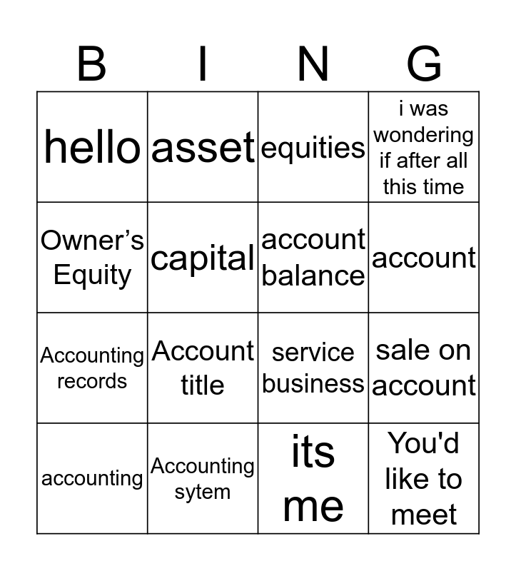 This bingo card has 16 words: Accounting sytem, sale on account, equities, hello, Accounting records, asset, service business, its me, Owner’s Equity, capital, accounting, i was wondering if after all this time, Account title, account, account balance and You'd like to meet.