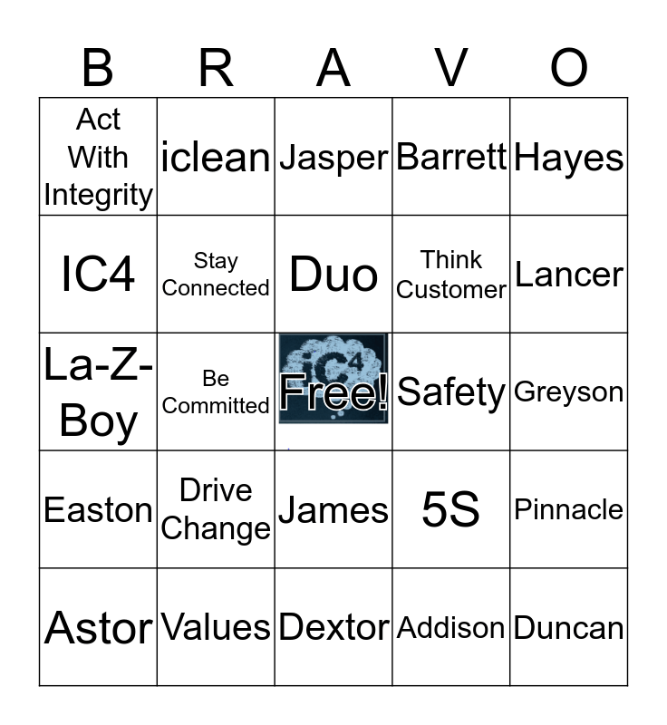 This bingo card has a free space and 24 words: Drive Change, Values, Duo, Astor, Hayes, Act With Integrity, IC4, iclean, Safety, James, Think Customer, La-Z-Boy, 5S, Pinnacle, Stay Connected, Addison, Greyson, Jasper, Lancer, Be Committed, Duncan, Easton, Barrett and Dextor.