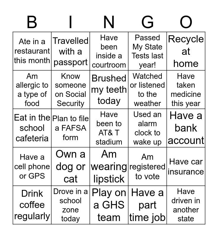 This bingo card has 25 words: Own a dog or cat, Play on a GHS team, Brushed my teeth today, Drink coffee regularly, Recycle at home, Ate in a restaurant this month, Am allergic to a type of food, Travelled with a passport, Used an alarm clock to wake up, Am wearing lipstick, Watched or listened to the weather, Eat in the school cafeteria, Am registered to vote, Have car insurance, Know someone on Social Security, Have driven in another state, Have a bank account, Have been inside a courtroom, Have taken medicine this year, Plan to file a FAFSA form, Have been to AT& T stadium, Drove in a school zone today, Have a cell phone or GPS, Passed My State Tests last year! and Have a part time job.