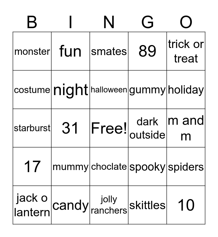 This bingo card has a free space and 24 words: mummy, candy, halloween, jack o lantern, trick or treat, monster, costume, fun, dark outside, choclate, gummy, starburst, spooky, spiders, night, skittles, m and m, smates, holiday, 31, 10, 17, 89 and jolly ranchers.