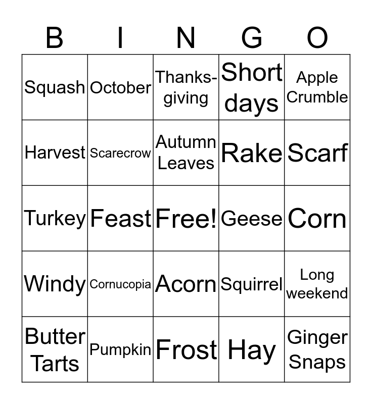 This bingo card has a free space and 24 words: Cornucopia, Pumpkin, Autumn Leaves, Butter Tarts, Apple Crumble, Squash, Harvest, October, Geese, Acorn, Rake, Turkey, Squirrel, Long weekend, Scarecrow, Hay, Corn, Thanks-giving, Scarf, Feast, Ginger Snaps, Windy, Short days and Frost.