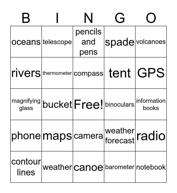This bingo card has a free space and 24 words: maps, weather, compass, contour lines, volcanoes, oceans, rivers, telescope, binoculars, camera, tent, magnifying glass, weather forecast, radio, thermometer, barometer, information books, pencils and pens, GPS, bucket, notebook, phone, spade and canoe.