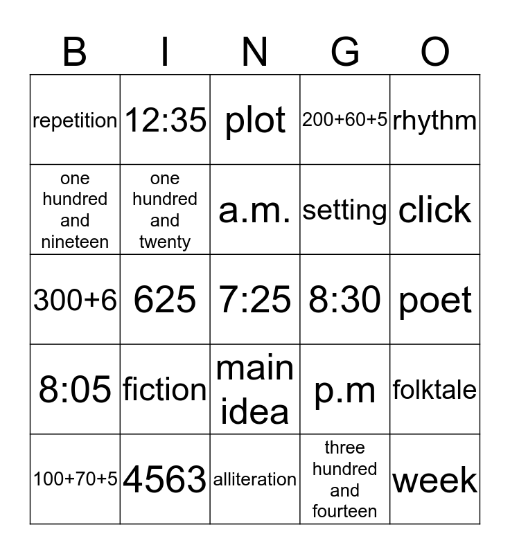 This bingo card has 25 words: fiction, alliteration, a.m., 100+70+5, rhythm, repetition, one hundred and nineteen, 12:35, 8:30, main idea, setting, 300+6, p.m, folktale, one hundred and twenty, week, poet, plot, click, 625, 7:25, 4563, 8:05, 200+60+5 and three hundred and fourteen.
