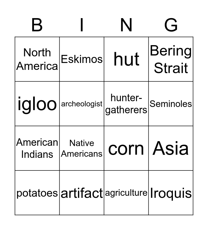 This bingo card has 16 words: artifact, Asia, hut, North America, American Indians, Eskimos, corn, agriculture, igloo, archeologist, potatoes, Bering Strait, Native Americans, Seminoles, hunter-gatherers and Iroquis.