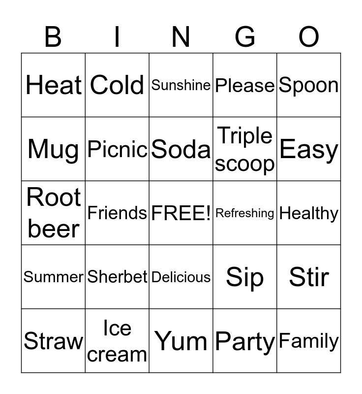 This bingo card has a free space and 24 words: Sherbet, Ice cream, Soda, Straw, Spoon, Heat, Mug, Cold, Refreshing, Delicious, Triple scoop, Root beer, Sip, Stir, Picnic, Party, Healthy, Sunshine, Easy, Friends, Family, Summer, Please and Yum.