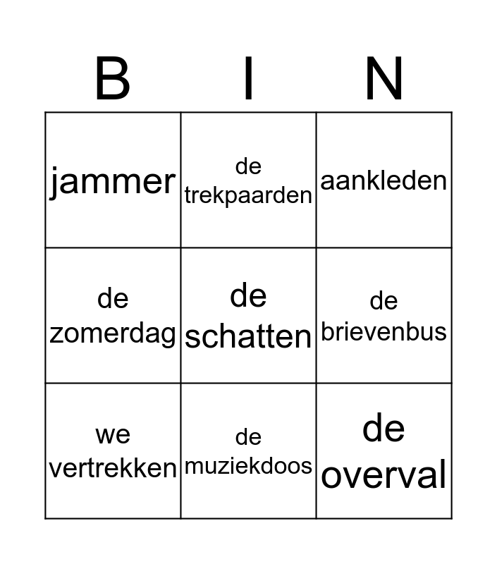 This bingo card has 21 words: Free!, de goudvissen, de trekpaarden, de paddenstoel, de aantallen, we vertrekken, jammer, aankleden, klaarmaken, de muziekdoos, de overval, de zomerdag, de slaapkamer, de boekentas, de brievenbus, de grootmoeder, de dierentuin, het ziekenhuis, de schatten, de schoten and we schrokken.