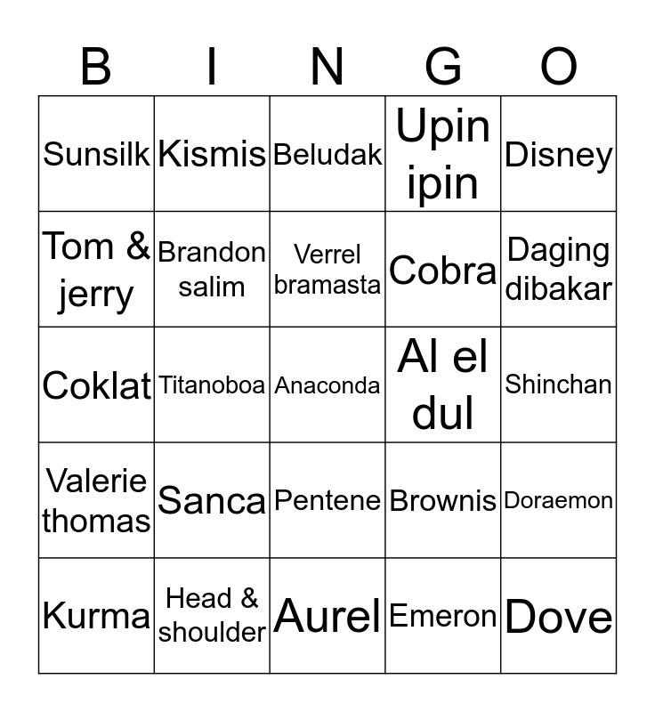 This bingo card has a free space and 24 words: Sanca, Head & shoulder, Verrel bramasta, Kurma, Disney, Sunsilk, Tom & jerry, Kismis, Al el dul, Pentene, Cobra, Coklat, Brownis, Doraemon, Brandon salim, Emeron, Shinchan, Beludak, Daging dibakar, Titanoboa, Dove, Valerie thomas, Upin ipin and Aurel.