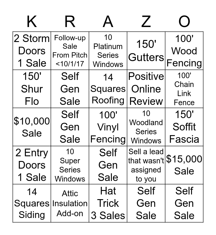 This bingo card has 25 words: 10 Super Series Windows, Hat Trick 3 Sales, 14 Squares Roofing, 14 Squares Siding, 100' Wood Fencing, 2 Storm Doors 1 Sale, 150' Shur Flo, Follow-up Sale From Pitch <10/1/17, 10 Woodland Series Windows, Self Gen Sale, Positive Online Review, $10,000 Sale, Sell a lead that wasn't assigned to you, $15,000 Sale, Self Gen Sale, Self Gen Sale, 150' Soffit Fascia, 10 Platinum Series Windows, 100' Chain Link Fence, Self Gen Sale, 100' Vinyl Fencing, Attic Insulation Add-on, 2 Entry Doors 1 Sale, 150' Gutters and Self Gen Sale.