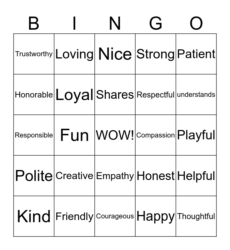 This bingo card has a free space and 24 words: Creative, Friendly, Shares, Kind, Patient, Trustworthy, Honorable, Loving, Compassion, Empathy, Respectful, Responsible, Honest, Helpful, Loyal, Happy, Playful, Nice, understands, Fun, Thoughtful, Polite, Strong and Courageous.