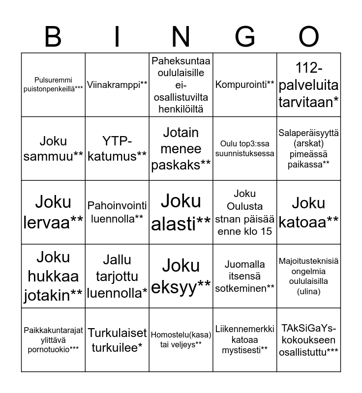 This bingo card has 25 words: Jallu tarjottu luennolla*, Homostelu(kasa) tai veljeys**, Jotain menee paskaks**, Paikkakuntarajat ylittävä pornotuokio***, 112-palveluita tarvitaan*, Pulsuremmi puistonpenkeillä***, Joku sammuu**, Viinakramppi**, Joku Oulusta stnan päisää enne klo 15, Joku eksyy**, Oulu top3:ssa suunnistuksessa, Joku lervaa**, Juomalla itsensä sotkeminen**, Majoitusteknisiä ongelmia oululaisilla (ulina), YTP-katumus**, TAkSiGaYs-kokoukseen osallistuttu***, Joku katoaa**, Paheksuntaa oululaisille ei-osallistuvilta henkilöiltä, Salaperäisyyttä (arskat) pimeässä paikassa**, Pahoinvointi luennolla**, Joku alasti**, Turkulaiset turkuilee*, Joku hukkaa jotakin**, Kompurointi** and Liikennemerkki katoaa mystisesti**.
