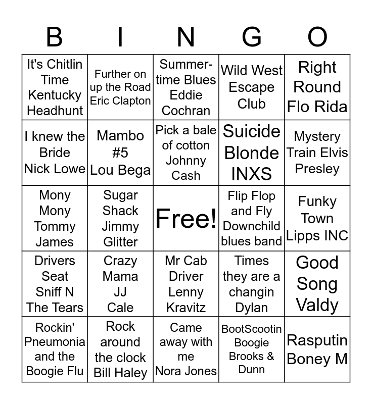 This bingo card has a free space and 24 words: Crazy Mama JJ Cale, Rock around the clock Bill Haley, Pick a bale of cotton Johnny Cash, Rockin' Pneumonia and the Boogie Flu, Right Round Flo Rida, It's Chitlin Time Kentucky Headhunt, I knew the Bride Nick Lowe, Further on up the Road Eric Clapton, Flip Flop and Fly Downchild blues band, Mr Cab Driver Lenny Kravitz, Suicide Blonde INXS, Mony Mony Tommy James, Times they are a changin Dylan, Good Song Valdy, Mambo #5 Lou Bega, BootScootin Boogie Brooks & Dunn, Funky Town Lipps INC, Summer- time Blues Eddie Cochran, Mystery Train Elvis Presley, Sugar Shack Jimmy Glitter, Rasputin Boney M, Drivers Seat Sniff N The Tears, Wild West Escape Club and Came away with me Nora Jones.