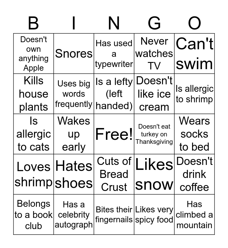 This bingo card has a free space and 26 words: Cuts of Bread Crust, Likes very spicy food, Is a lefty (left handed), Has a celebrity autograph, Can't swim, Doesn't own anything Apple, Kills house plants, Snores, Wears socks to bed, Likes snow, Doesn't like ice cream, Is allergic to cats, Doesn't drink coffee, Belongs to a book club, Wakes up early, Flosses twice a day, Never watches TV, Loves shrimp, Has used a typewriter, Has climbed a mountain, Is allergic to shrimp, Bites their fingernails, Doesn't eat turkey on Thanksgiving, Hates shoes, Uses big words frequently and Is happy with their weight.