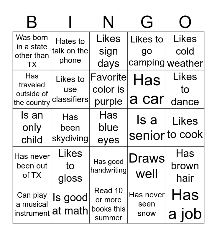This bingo card has 25 words: Likes to gloss, Read 10 or more books this summer, Favorite color is purple, Can play a musical instrument, Likes cold weather, Was born in a state other than TX, Has traveled outside of the country, Hates to talk on the phone, Is a senior, Has good handwriting, Has a car, Is an only child, Draws well, Has brown hair, Likes to use classifiers, Has a job, Likes to cook, Likes sign days, Likes to dance, Has been skydiving, Has blue eyes, Is good at math, Has never been out of TX, Likes to go camping and Has never seen snow.