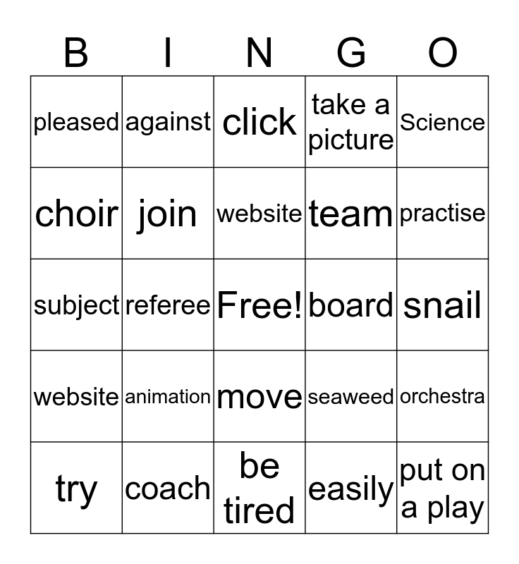 This bingo card has a free space and 24 words: animation, coach, website, try, Science, pleased, choir, against, board, move, team, subject, seaweed, orchestra, join, easily, snail, click, practise, referee, put on a play, website, take a picture and be tired.