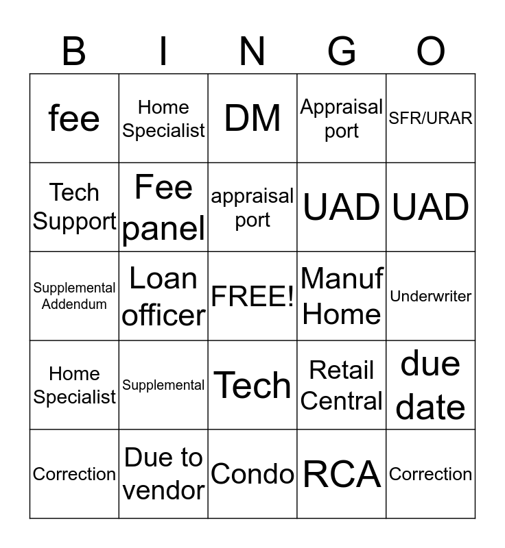 This bingo card has a free space and 52 words: Appraiser, Correction, Retail East, Condo, Supplemental, Underwriter, Home Specialist, Reviewer, Tech Support, FHA SFR, Fee panel, DM, due date, Retail Central, Retail West, Invoicing, appraisal port, Manuf Home, FHA Case#, SFR/URAR, Loan officer, RCA, fee, UAD, SFR/URAR, Loan officer, RCA, fee, UAD, Retail West, Invoicing, Appraisal port, Manufactured Home, FHA Case#, Fee Panel, DM, Due to vendor, Due to customer, Retail Central, Retail West, Retail East, Underwriter, Home Specialist, Reviewer, Tech, FHA SFR, Correction, Supplemental Addendum, Condo, Multi-Family 2-4 Units, Correction and Appraiser.