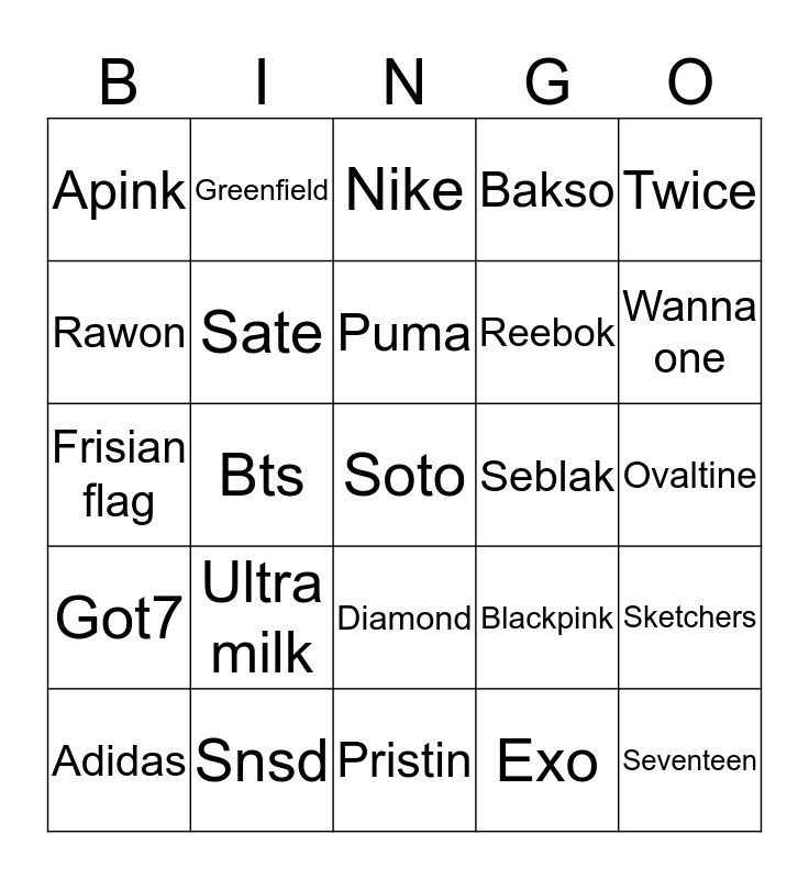 This bingo card has a free space and 24 words: Ultra milk, Snsd, Puma, Adidas, Twice, Apink, Rawon, Greenfield, Seblak, Diamond, Reebok, Frisian flag, Blackpink, Sketchers, Sate, Exo, Ovaltine, Nike, Wanna one, Bts, Seventeen, Got7, Bakso and Pristin.