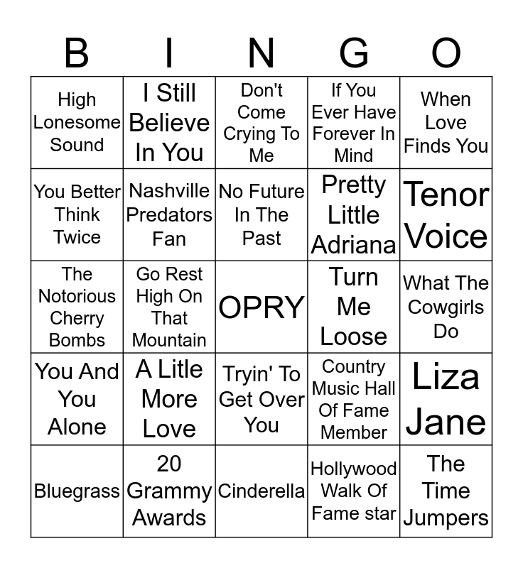This bingo card has a free space and 65 words: When I Call Your Name, Never Knew Lonely, Pocket Full Of Gold, Liza Jane, Look At Us, Take Your Memory With You, I Still Believe In You, Don't Let Our Love Start Slippin' Away, No Future In The Past, One More Last Chance, Tryin' To Get Over You, Whenever You Come Around, What The Cowgirls Do, When Love Finds You, Which Bridge To Cross (Which Bridge To Burn), You Better Think Twice, Go Rest High On That Mountain, High Lonesome Sound, Worlds Apart, Pretty Little Adriana, A Litle More Love, You And You Alone, If You Ever Have Forever In Mind, My Kind Of Woman/ My Kind Of Man, Feels Like Love, These Days, Guitar Slinger, Bakersfield, The Time Jumpers, Pure Prairie League, Bluegrass, Souvenirs, Amy Grant, Opry Member, Country Music Hall Of Fame Member, 20 Grammy Awards, Norman, Oklahoma, The Notorious Cherry Bombs, Hollywood Walk Of Fame star, Songwriter, Nashville Predators Fan, Guitar player, Turn Me Loose, Boone Creek, Let's Make Sure We Kiss Goodbye, The Bluegrass Alliance, Tenor Voice, If It Weren't For Him, Record producer, Next Big Thing, The Reason Why, Victim Of Life's Circumstances, Oh Carolina, Cinderella, The Radio, Oklahoma Borderline, Kindly Keep It Country, Don't Come Crying To Me, Golfer, Musician, Down To My Last Bad Habit, Me And My Girl, Sad One Comin' On, The Key To Life and Threaten Me With Heaven.